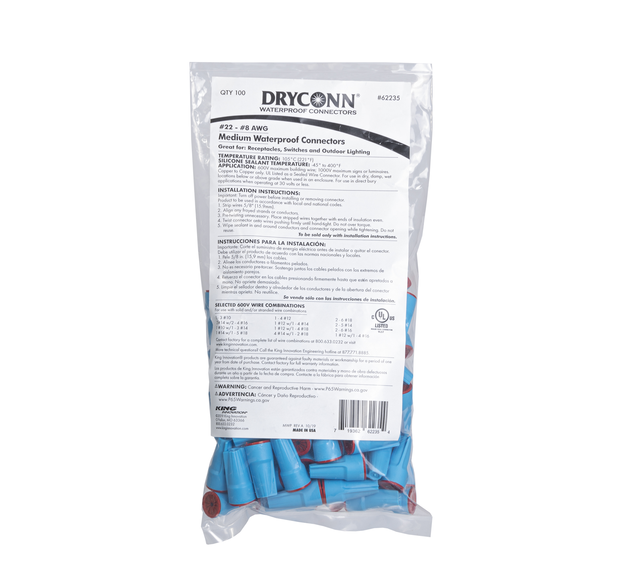 WHERE TO BUYWaterproof your outdoor splices with the DryConn Medium, Aqua/Red wire connector. This quality one-step connector is filled with a dielectric silicone sealant that surrounds splices, making it water and corrosion resistant. This is an ideal choice for outdoor electrical connections exposed to condensation, water vapors or dust. The DryConn Aqua/Red meets the conditions set by the most recent NEC Code Book, requiring a UL 486G listed connector to be used for all splices in wet and damp locations.